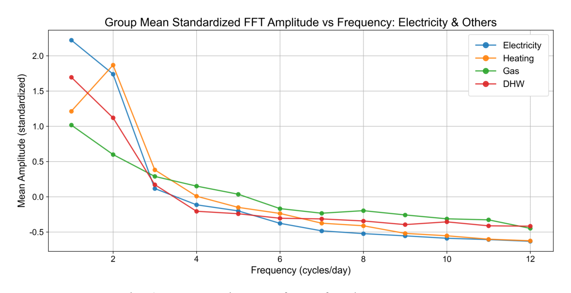 건물군의 전기와 난방 사용량에 고속 푸리에 변환(FFT)을 적용하여 주파수 도메인 분석을 실시한 결과, 두 변수 간 피어슨 상관계수가 0.72로 산출되어