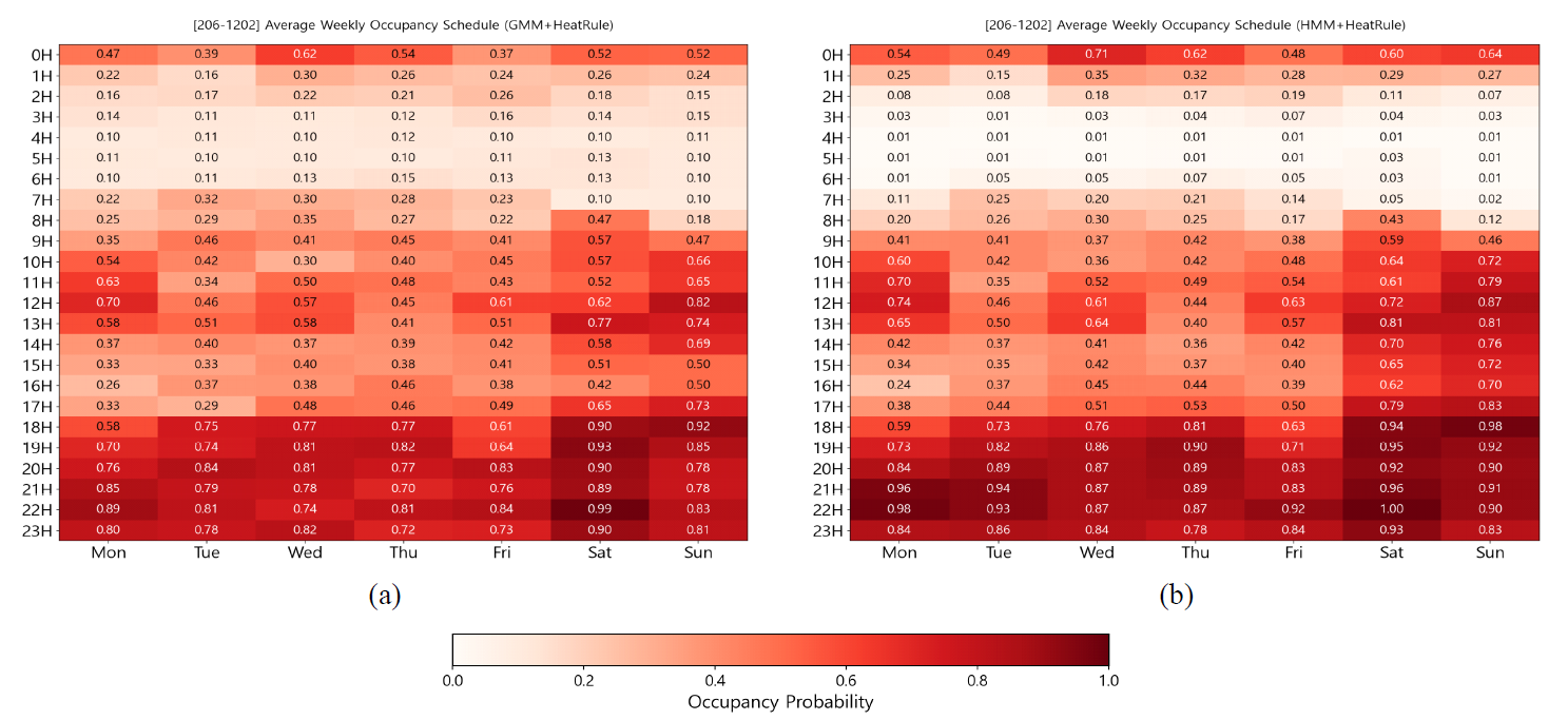 모델인 가우시안 혼합 모델(GMM) 및 은닉 마르코프 모델(HMM) 알고리즘을 적용하여 재실 확률을 산정하였으며, 난방 사용량 및 사용 시간에 따른
