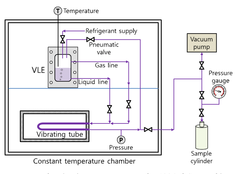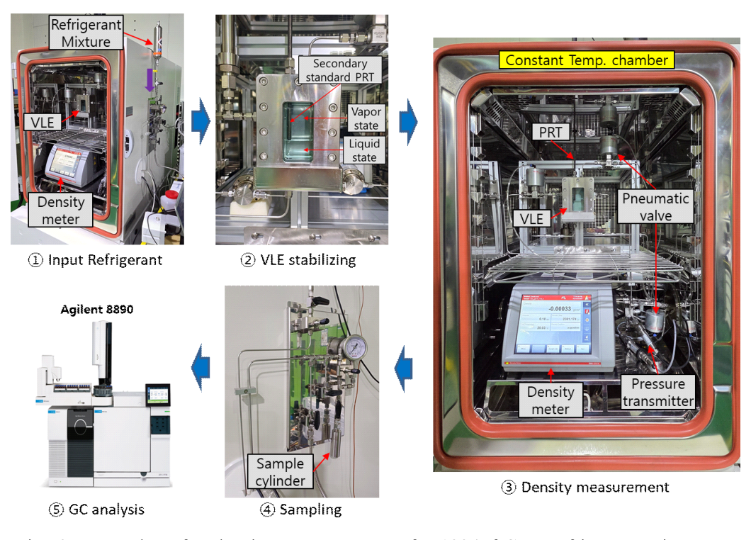 수행하였다. 공칭 질량비 3:1의 비율로 R32와 R125를 혼합하였고, 이 혼합냉매의 기체 상태 및 액체 상태의 포화상태 부근 밀도를 측정하여 REFPROP10(10)의 값과 비교하였다. 평형셀 안 포화상태의 기체 또는 액체 혼합냉매를 진동튜브 밀도계의 U-자 튜브 내에 주입하는 과정에 U-자 튜브 내에서 재차