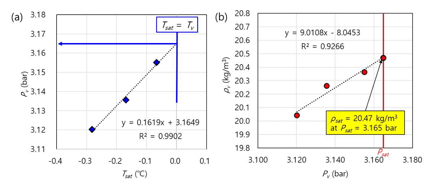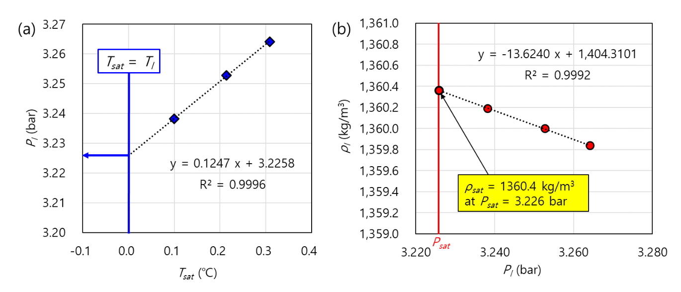 일어나지 않는 상태이다. 과냉도를 0.3℃에서 0.1℃로 낮춰가면서 3개 온도에서 밀도값을 측정하였다. Fig. 5(a)에서 보듯이 과냉도를 줄여가면서 포화 온도 $T_{sat}$과 진동튜브 내부 압력 $P_l$ 사이 관계를 도시할 수 있으며, 과냉도가 0이 되는 지점이