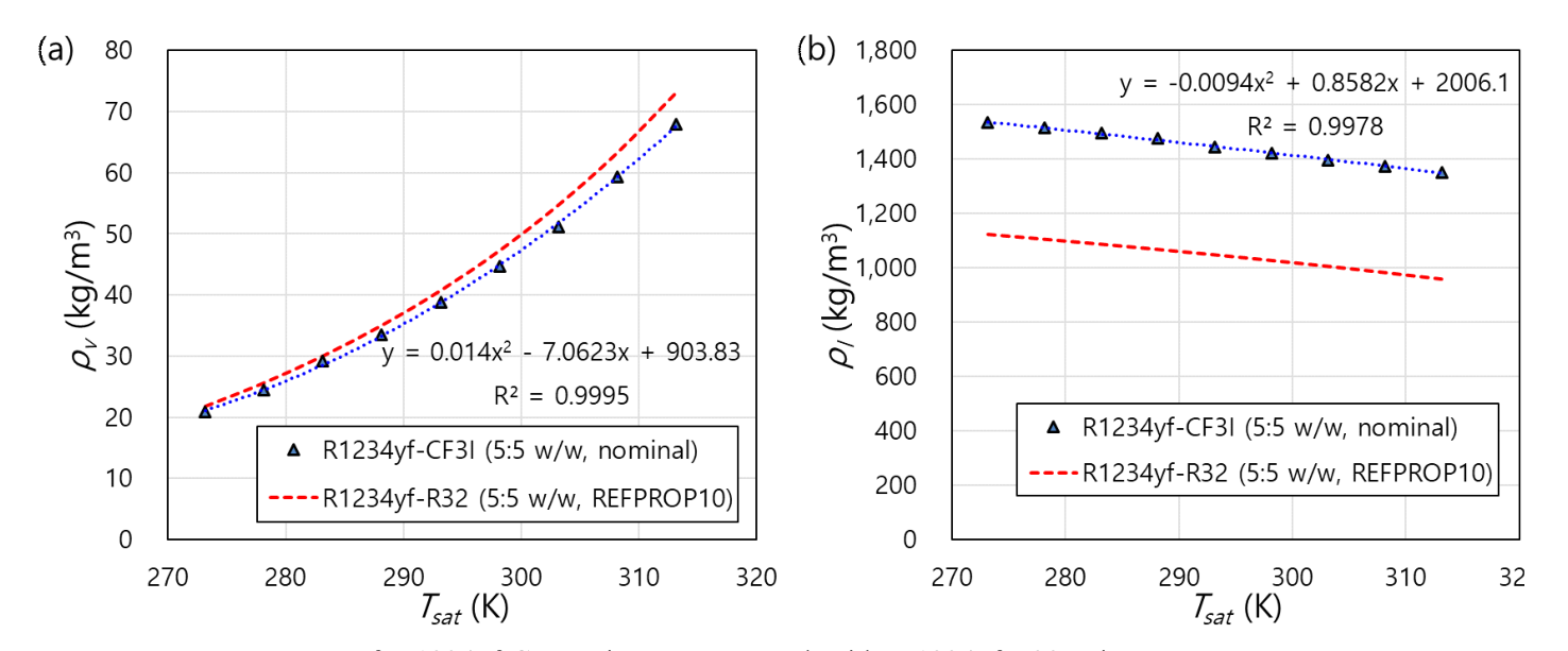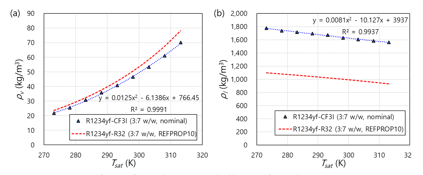 Fig. 8 Saturation densities of R1234yf-CF3I mixture compared with R1234yf-R32 mixture (a) Vapor density and (b) Liquid density