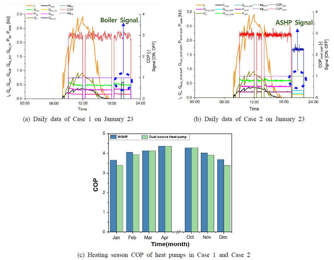 (1) 난방 성능 측면에서, 1월 23일과 같은 혹한기에는 저온 축열 조건으로 인해 PVT 입구 온도가 낮게 유지되면서 일일 집열량이 Case 1에서