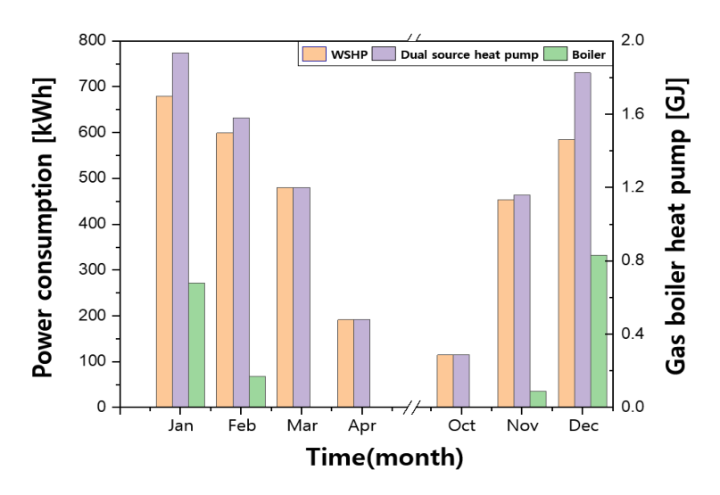Fig. 4는 난방 시즌 동안 Case 1과 Case 2의 에너지 소비량을 나타낸다. Fig. 4의 Case 1에서는 저온 축열이 발생한 1월, 2월, 11월, 12월에 가스보일러가 가동되었으며, 이 기간 동안 물-물 히트펌프의 소비전력은 2,316.1