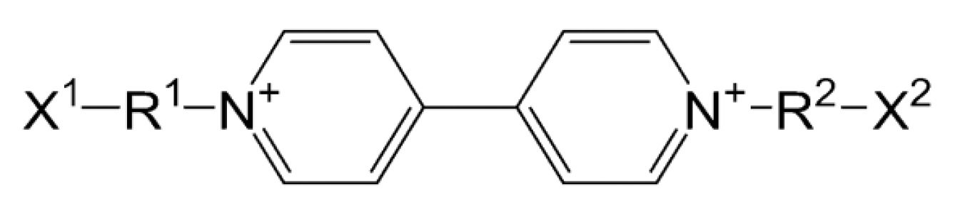 여기서, R1 및 R2는 각기 독립적으로 X1 및 X2에 의해 치환된 C1 ~ C10 범위의 선형 또는 분지형 알킬기를 의미하며, X1 및 X2는 각각 독립적으로 -NH2, -NR3H, -NR3R4, -COOH, -SO3H, -SO2H 또는 -PR3R로 구성된 군으로부터 선택된다. 여기서 R3 및 R4는 각각 독립적으로 C1~ C10 알킬기이다.