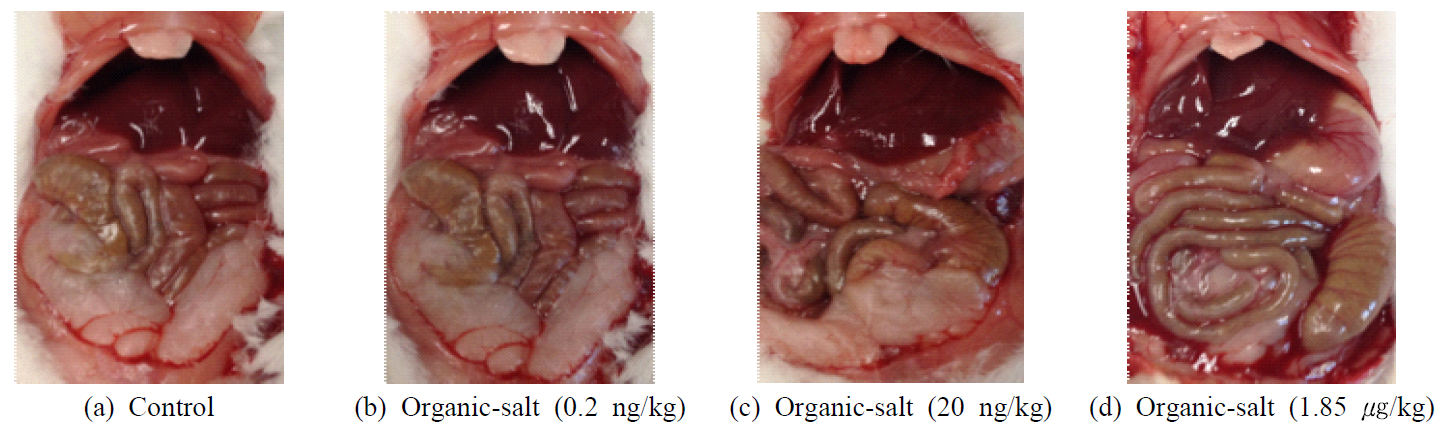 보수적으로 평가하기 위하여, 실제 사용 환경보다 훨씬 가혹한 조건인 수용액 상태에서의 경구 직접 투여 방식으로 Mice 경구 투여 시험에서도 독성