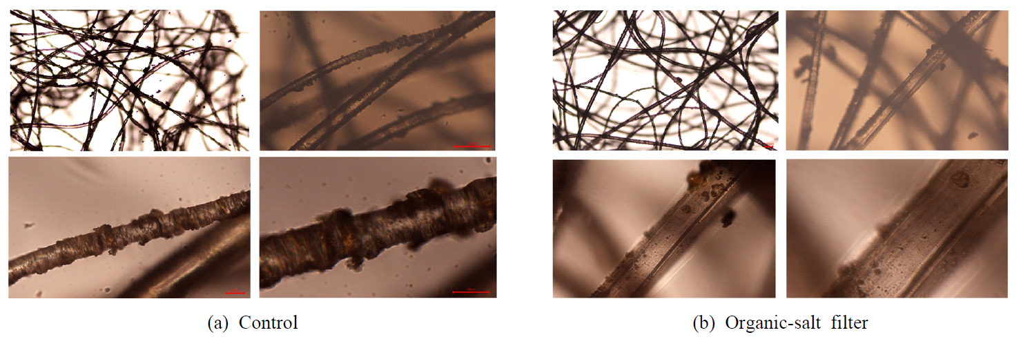 필터 내부 오염도를 확인하기 위해 표면을 멸균된 증류수로 세척한 후 섬유층 내부를 관찰하였다(Fig. 5). 일반필터는 세척 후에도 내부 섬유층이 뿌옇게 흐릿한 형태를 보였으며, 이는 미세입자 및 미생물성 오염물이 섬유 기공 깊숙한 곳까지 침투하여 고착되었음을