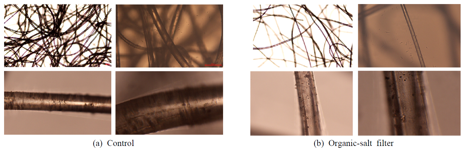 문제를 직접적으로 보여준다. 반면 유기소금 소재 필터는 동일한 조건에서 표면 오염 억제뿐 아니라 내부 오염 확산 차단이 명확히 나타났으며, 이는 멜트블로운
