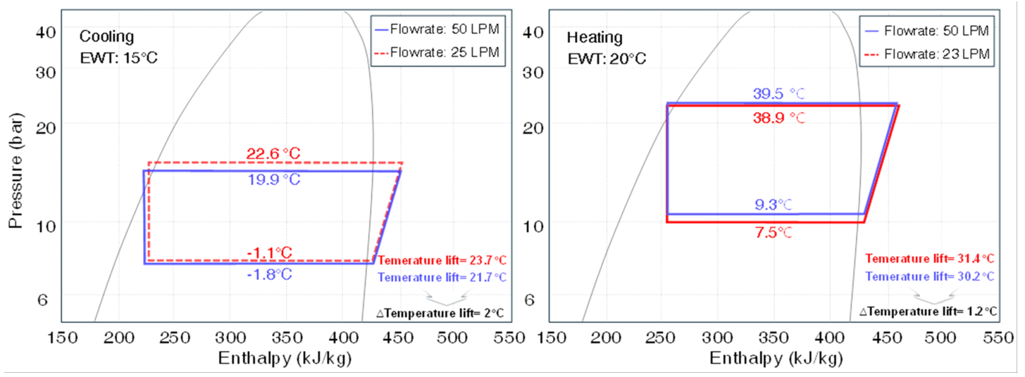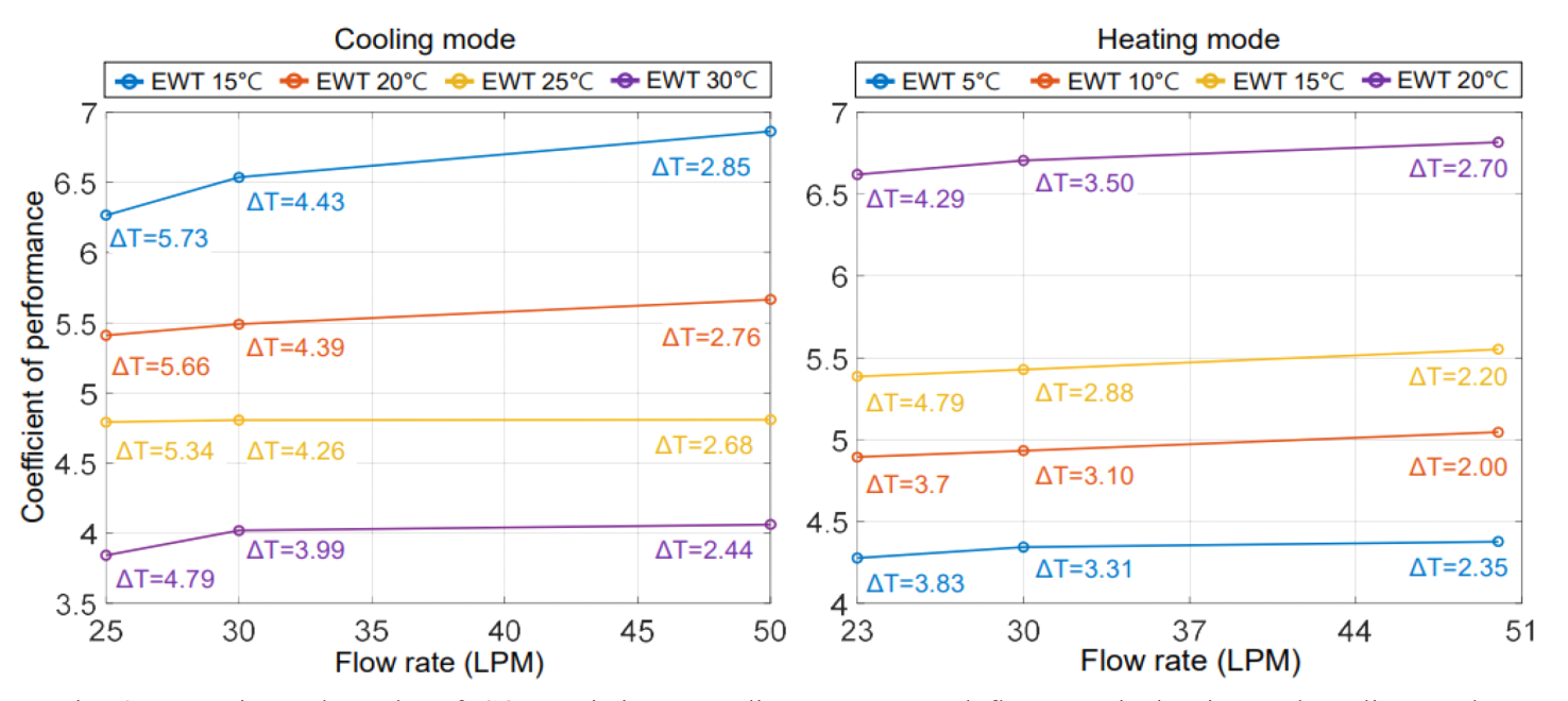 냉방 모드에서는 동일한 EWT 조건에서 유량이 증가함에 따라 COP이 완만히 증가하는 경향을 보였다. 이는 유량 증가에 따라 열원 측 열교환기의 열전달량이