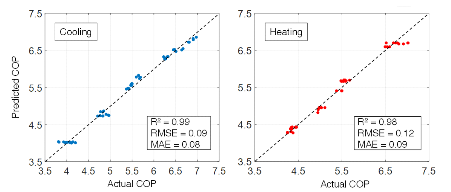 실험을 통해 계측한 열원 측 입․출구 온도차(ΔT)와 EWT 데이터를 기반으로 구축한 식(2)의 COP 예측 회귀모델의 정합성을 분석하고자 Fig. 4과 같이 산점도 분포를 분석하였다. 전체 데이터 중 80%를 학습, 20%를 검증으로 분할하여 평가한 결과, 냉방 및 난방 예측 모두에서 R²이 0.9
