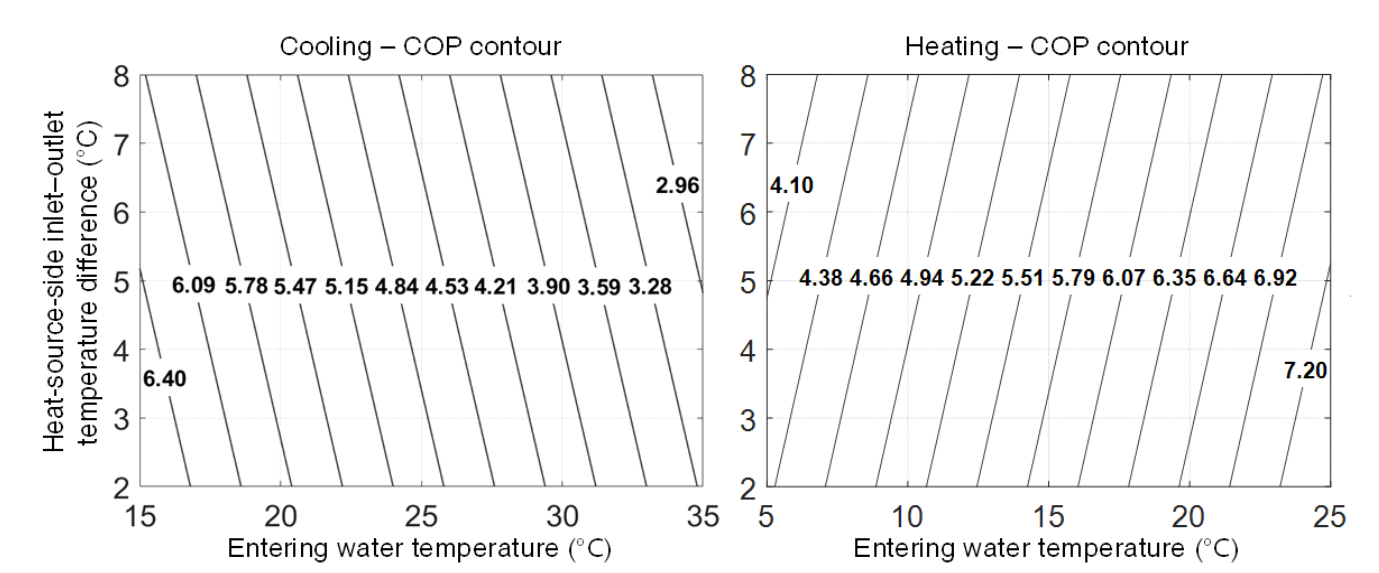 실험 데이터를 기반으로 구축한 회귀모델(식(2))을 활용하여 열원 측 입구 온도(EWT)와 입․출구 온도차(ΔT) 간의 연속적인 관계를 확장하였으며, 그 결과를 Fig. 5에 나타내었다. 해당 결과를 통해 실험으로 수행하지 않은 조건 구간에서도 COP의 분포를 시각적으로 확인할 수 있었고, 히트펌프의 열원 조건 변화에