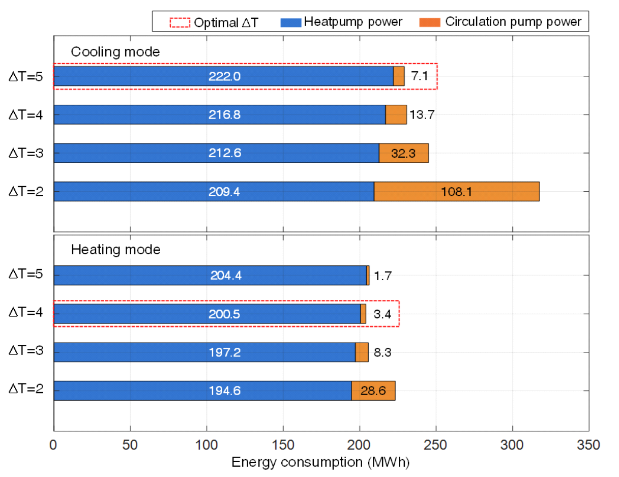 냉방 모드에서는 ΔT가 2℃에서 5℃로 증가함에 따라 히트펌프의 전력 소비는 209.4 MWh에서 222.0 MWh로 약 6% 증가한 반면, 순환펌프의